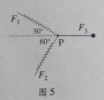 16.如图5所示的水平面上,橡皮绳一端固定,另一端连接两根弹簧,连接点P在F1、F2和F3三力作用下保持静止。下列判断正确的是