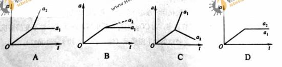 如图,在光滑水平面上有以质量为m1的足够长的木板,其上叠放以质量为m2的木块.假定木块和木板之间的最大静摩擦力和滑动摩擦力相等。现给木块施加一随时间t增大的水平力F=kt (k是常数),木板和木块加速度的大小分别为