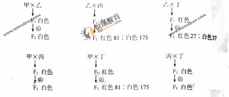 某植物红花和白花这对相对性状同时受多对等位基因控制 (如A、a; B、b; C、c··· ···)。当个体的基因型中每对等位基因都至少含有一个显性基因时(即A-B-C-··· ···)才开红花,否则开白花。现有甲、乙、丙、丁4个纯合白花品系,相互之间进行杂交,杂交组合、后代表现型及其比例如下:
