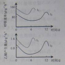某种蔬菜离体叶片在黑暗中不同温度条件下呼吸速率和乙烯产生量的变化如图所示,t1、、t2表示10-30°C之间的两个不同温度。下列分析正确的是