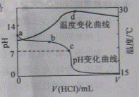 氨水中,溶液pH和温度随加入盐酸体积变化曲线如右图所示。下列有关说法正确的是