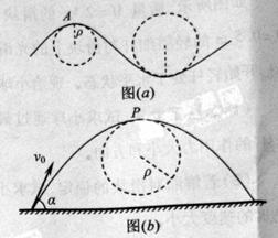 一般的曲线运动可以分成很多小段,每小段都可以看成圆周运动的一部分,即把整条曲线用一系列不同半径的小圆弧来代替。如图(a)所示,曲线上的A点的曲率圆定义为:通过A点和曲线上紧邻A点两侧的两点作一圆,在极限情况下,这个圆就叫做A点的曲率圆,其半径ρ叫做A点的曲率半径。现将一物体沿与水平面成α角的方向已速度υ0抛出,如图(b)所示。则在其轨迹最高点p处的曲率半径是