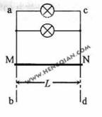 如图,两根足够长的金属导轨ab、cd竖直放置,导轨间距离为L,电阻不计。在导轨上端并接两个额定功率均为P、电阻均为R的小灯泡。整个系统置于匀强磁场中,磁感应强度方向与导轨所在平面垂直。现将一质量为m、电阻可以忽略的金属棒MN从图示位置由静止开始释放。金属棒下落过程中保持水平,且与导轨接触良好。已知某时刻后两灯泡保持正常发光。重力加速度为g。求:![]()