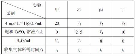 12.实验室用Zn与稀H2SO4反应来制取氢气,常加少量CuSO4来加快反应速率。为了研究CuSO4的量对H2生成速率的影响,某同学设计了实验方案(见下表),将表中所给的试剂按一定体积混合后,分别加入四个盛有相同大小的Zn片(过量)的反应瓶(甲、乙、丙、丁)中,收集产生的气体,并记录收集相同体积的气体所需的时间。