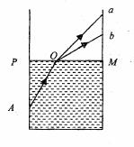 如图所示,容器中盛有水,PM为水面,从A点发出一束白光,射到水面上的O点后,折射光发生了色散照到器壁上a、b之间,对应a、b两种颜色的单色光,则( )