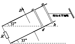 (19分)如图所示,相距0.5m足够长的两根光滑导轨与水平面成37°角,导轨电阻不计,下端连接阻值为2Ω的电阻R,导轨处在磁感应强度B=2T的匀强磁场中,磁场方向垂直导轨平面斜向上.ab、cd为水平金属棒且与导轨接触良好,它们的质量均为0.5kg、电阻均为2Ω.ab棒与一绝缘水平细绳相连处于静止状态,现让cd棒从静止开始下滑,直至与ab相连的细绳刚好被拉断,在此过程中电阻R上产生的热量为0.5J,已知细线能承受的最大拉力为5N.求细绳被拉断时:(g=10m/s2,sin37°=0.6)