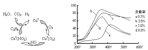 Ⅰ.用乙烯作为还原剂将氮的氧化物还原为N2是燃煤烟气的一种脱硝(除NOx)技术。其脱硝机理如下图1,脱硝率与温度、负载率(分子筛中催化剂的质量分数)的关系如下图2所示。