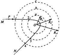 射入点电荷O的电场,在电场力作用下的运动轨迹是曲线MN。a、b、c是以O为中心,