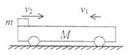 32.(16分)质量为M=4m的小车以v1=0.5m/s沿光滑水平面向左运动。质量为m的铁块以v2=1m/s从小车左端向右冲上小车,最终和小车以相同的速度共同运动。求它们共同运动的速度大小和方向。若这个过程经历了t=1.8s,求该过程铁块相对于地面向右移动的最大距离。