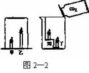 9. 图2-2表示两项实验:①在燃着的蜡烛甲、乙上倒扣一只玻璃圆筒;②往放在燃着的蜡烛丙、丁的烧杯中慢慢倾入CO2气体。在两项实验中先熄灭的蜡烛分别是