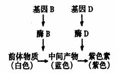 香豌豆能利用体内的前体物质经过一系列代谢过程逐步合成蓝色中间产物和紫色色素,此过程是由B、b和D、d两对等位基因控制(如右图所示),两对基因不在同一对染色体上。其中具有紫色素的植株开紫花,只具有蓝色中间产物的开蓝花,两者都没有则开白花。据右图的下列叙述中,不正确的是