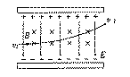 如右图,正交的匀强磁场和匀强电场的磁感应强度和电场强度分别为B和E,一带E电的粒子,以速度v1垂直射入,而以速度v2射出,则( )