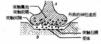 (1)突触间隙存在,使神经信号传导只有某些化学物质既神经递质(如乙酰胆碱)参与下,神经递质由A细胞合成经过 (细胞器)包装加工,形成突触囊泡,后者再与 融合,而将神经递质释放进入突触间隙。