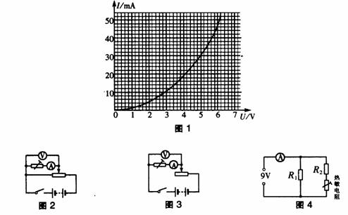 (2)在图4电路中,电源电压恒为9V,电流表读数为70mA,定值电阻R1=250Ω。由热敏电阻的I-U关系曲线可知热敏电阻两端的电压为- V;电阻R2的阻值为 Ω。(6分)