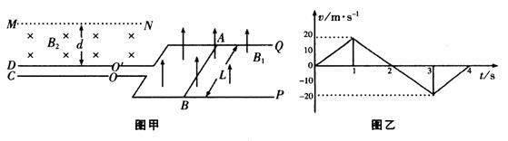 34.(20分)如图甲所示,两水平放置的平行金属板C、D相距很近,上面分别开有小孔O和O,,水平放置的平行金属导轨P、Q与金属板C、D接触良好,且导轨垂直放在磁感应强度为Bl=10T的匀强磁场中,导轨间距L=0.50m,金属棒AB紧贴着导轨沿平行导轨方向在磁场中做往复运动,其速度图象如图乙,若规定向右运动速度方向为正方向。从t=0时刻开始,由C板小孔处连续不断地以垂直于C板方向飘人质量为m=3.2×l0-21kg、电量q=1.6×lO-l9c的带正电的粒子(设飘人速度很小,可视为零)。在D板外侧有以MN为边界的匀强磁场B2=10T,MN与D相距d=10cm,B1和B2方向如图所示(粒子重力及相互作用力不计),求: