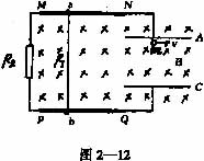 (28分)如图2-12所示,MN和PQ是相距40cm的平行金属导轨,一根电阻R1=3Ω的金属棒ab可紧贴平行导轨运动,两块相互平行、相距20cm且水平放置的金属板A和C分别与两平行导轨相连接,图中跨接在MN间的电阻R2=1Ω,导轨和连接线的电阻均可忽略不计,现将整个装置放置在图示的匀强磁场中,当导体棒ab以速率v匀速沿导轨运动时,恰能使一个质量为m、带电量为q的负电微粒也以速率v在两金属板内空间做匀速圆周运动而不触及两板,求: