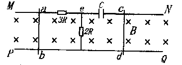 32.(22分)如下图所示,水平放置的两根光滑导轨MN和PQ之间的距离为L,在导轨中间接有两个电阻和一个电容器;电阻器的阻值分别为3R和2R,电容器的电容为C。金属棒ab和cd的阻值均为R,导轨的电阻不计。整个装置处于竖直向下的匀强磁场中,磁感应强度为B;现让金属棒cd以速度2v向右匀速运动,同时再用一个水平力使金属棒ab以速度v向左匀速运动,求: