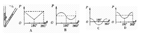 如图所示,在一端开口且足够长的玻璃管内,有一小段水银柱封住了一段空气柱。当玻璃管绕通过其封闭端的水平轴,从竖直位置开始,顺时针方向缓慢转动,在转动一周的过程中,管内空气压强p随夹角θ变化的关系图象大致为 ( )