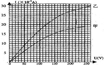 21.用图象分析处理实验数据是科学研究中十种常用的方法, 右图为甲、乙两灯泡的I-U图象。根据图象,计算甲、乙两灯泡并联在电压为220V的电路中,实际发光的功率约为