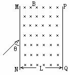 (18分)如图所示,在真空区域内,有宽度为L的无限大匀强磁场,磁感应强度为B,磁场方向垂直纸面向里,MN、PQ为磁场的边界。质量为m、带电为-q的粒子,经加速电场加速后射沿着与MN夹角为θ(0°<θ<90°)的方向垂直于磁感线射入匀强磁场中。粒子刚好能垂直于PQ射出磁场(不计重力影响,粒子加速前的速度认为是0),求:⑴加速电压U。⑵为使粒子经电压U加速射入磁场后沿直线射出PQ边界,可在磁场区域加一匀强电场,求该电场的场强大小和方向。