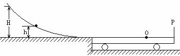 25、(20分)如图所示,光滑固定斜槽轨道的水平出口和停在光滑水平面上的平板小车上表面相平,小车的右端固定一个弹性挡板。质量为m的小物块从光滑斜槽轨道上由静止开始下滑,滑上平板小车,使得小车在光滑水平面上滑动。第一次小物块从光滑斜槽轨道上高为h处由静止开始下滑,小物块最终停在平板车上的O点。第二次小物块从光滑斜槽轨道上某处(图中H高处)由静止开始下滑,小物块能够到达小车右端与弹性挡板P相碰后仍停在O点。已知平板小车的质量为3m,O点到右端弹性板的距离是车长的