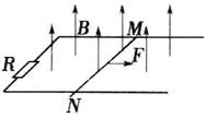 32.(17分)如图,水平放置的平行光滑导轨相距为L,一端接有电阻R。质量为m的导体棒MN垂直放在导轨上。整个装置处于与导轨平面垂直的匀强磁场中,磁场的磁感强度为B,方向如图所示。不计导轨及导体棒的电阻。现用与导轨平行的恒力F向右拉MN。设导轨足够长。求: