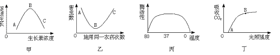 D.丁图中,要提高农作物产量,光照强度应大于B点
