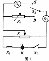 相连,调节滑线变阻器R,当电流表G2有某一合理的示数时,记下电流表G1的示数I;然后将开关S2与