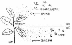 41.(8分)当烟草叶片受到甲种蛾幼虫的采食刺激后,会释放出挥发性的化学物质。这种化学物质白天会吸引甲种蛾幼虫的天敌,夜间会驱赶乙种蛾,使其不能在烟草叶片上产卵(乙种蛾幼虫也采食烟草叶片),如图所示。试回答: