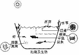 42.(8分)拟调查一个池塘生态系统(如图)的组成成分。请根据图示及提供的实验器材,写出调查项目。