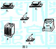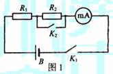 (2)利用图1所示的电路测量电流表mA的内阻RA。图中R1、R2为电阻,K1、K2为电键,B是电源(内阻可忽略)。
