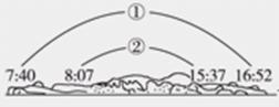 下图为我国①②两地某日日出日落(北京时间)示意图。根据你的生活经验和所学知识,该日最有可能是
