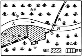 (1)在图中①-④处分别设立造纸厂、制伞厂、自来水厂、精密仪表厂,你认为最合理的安排是:①处 ,②处 ,③处 ,④处 。