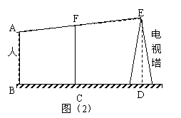 如图(2),某测量工作人员的眼与标杆顶端F,电视塔顶端E在同一直线上,已知此人身高为1.6米,标杆为3.2米,且BC=1米,CD=5米,则电视塔的高ED=