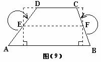 任意剪一个梯形纸片,利用对折的方法找到腰的中点E、F,按图(9)中所示的方法分别将含∠A,∠B的部分向里剪下①,②,并图中箭头所示的方向旋转180°,