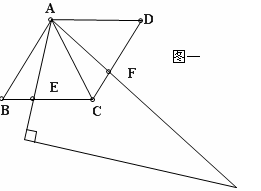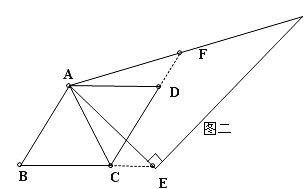 当三角尺的两边分别与菱形的两边BC、BD的延长线交于点E、F时,如图二,你在(1)中得到解决的结论还成立吗?请说明理由。