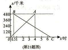 21.(12分)某汽车公司有豪华和普通两种客车在甲、乙两城市之间运营.已知每隔1小时有一辆豪华客车从甲城开往乙城,如图所示,OA是第一辆豪华客车离开甲城的路程s(单位:千米)与运行时间t(单位:时)的函数图象,BC是一辆从乙城开往甲城的普通客车距甲城的路程s(单位:千米)与运行时间t(单位:时)的函数图象.请根据图中提供的信息,解答下列问题: