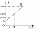 (10分)某水库原有一定量储水,为备足水源,今从上游向水库注水,(注满30000m3为止),水库蓄水量y (m3)与注水时间t(天)成一次函数,其图象如所示。求:①蓄水量y(m3)与注水时间t(天)之间的函数关系式。②水库原有储水量多少m3 ③水库注满水需要多少天?