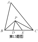15、如图,在ΔABC中,BC=5 cm,BP、CP分别是∠ABC和∠ACB的角平分线,且PD∥AB,PE∥AC,则ΔPDE的周长是___________ cm.