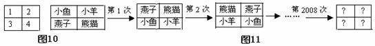 18.为迎接2008年北京奥运会,孝感市某中学课外科技小组的同学们设计制作了一个电动智能玩具,玩具中的四个动物小鱼、小羊、燕子和熊猫分别在1、2、3、4号位置上(如图10),玩具的程序是:让四个动物按图11所示的规律变换位置,第一次上、下两排交换位置;第二次是在第一次换位后,再左、右两列交换位置;第三次再上、下两排交换位置;第四次再左、右两列交换位置;按这种规律,一直交换下去,那么第2008次交换位置后,熊猫所在位置的号码是 _______________号.