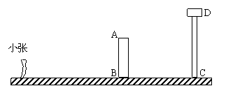 如图,一天早上,小张正向着教学楼AB走去,他发现教学楼后面有一水塔DC,可过了一会抬头一看:“怎么看不到水塔了?”心里很是纳闷。经过了解,教学楼、水塔的高分别为20m和30m,它们之间的距离为30m,小张身高为1.6m。小张要想看到水塔,他与教学楼的距离至少应有多少m?