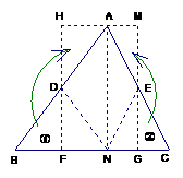 26、任意剪一个三角形纸片,如图中的△ABC,设它的一个锐角为∠A,首先利用对折的方法得到高AN,然后按图中所示的方法分别将含有∠B、∠C的部分向里折,找出AB、AC的中点D、E,同时得到两条折痕DF、EG,分别沿折痕DF、EG剪下图中的三角形①、②,并按图中箭头所指的方向分别旋转180°。