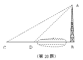 20.(本题9分)如图,河对岸有一铁塔AB。在C处测得塔顶A的仰角为30°,向塔前进16米到达D,在D处测得A的仰角为45°,求铁塔AB的高。