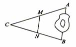 12. A、B两点被池塘隔开(如下图),在AB外选一点C,连结AC和BC并分别找出其中点M、N,若测得MN=20m,则A、B两点的距离为___________。