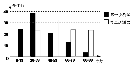 (3)第一次测试中,中位数在        分数段,第二次测试中,中位数在        分数段.