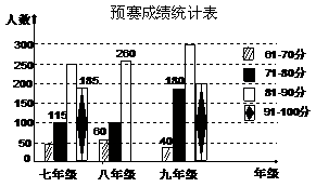 复赛成绩中七年级的众数是 ;八年级的中位数是 ;九年级的平均数是 .