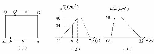 24.如图(1),在矩形ABCD中,AB=10cm,BC=8cm,点P从A点出发,沿A→B→C→D路线运动,到D停止;点Q从D出发,沿D→C→B→A路线运动,到A停止,若点P、点Q同时出发,点P的速度为1 cm/s,点Q的速度为2 cm/s,as后点P、点Q同时改变速度,点P的速度变为b cm/s,点Q的速度变为d cm/s。图(2)是点P出发x s后△APD的面积![]()