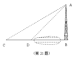 21.(本题8分)如图,河对岸有一铁塔AB。在C处测得塔顶A的仰角为30°,向塔前进16米到达D,在D处测得A的仰角为45°,求铁塔AB的高。