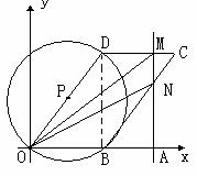 如图,四边形OBCD为平行四边形,OD=2,∠DOB=60°,以OD为直径的⊙P经过点B,N为BC上任意一点(与B、C不重合),过N作直线MN⊥x轴,垂足为A,MN交DC于M,设OA=t,OMN的面积为S。
