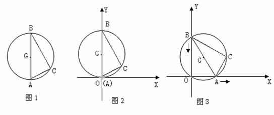 图1是用钢丝制作的一个几何探究工具,其中△ABC内接于⊙G,AB是⊙G的直径,AB=6,AC=3.现将制作的几何探究工具放在平面直角坐标系中(如图2),然后点A在射线OX上由点O开始向右滑动,点B在射线OY上也随之向点O滑动(如图3),当点B滑动至与点O重合时运动结束.